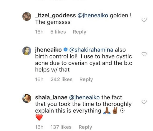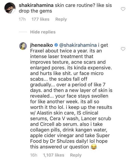 “I get Fraxel about twice a year. It’s an intense laser treatment that improves texture, acne scars and enlarged pores. It’s kinda expensive. and hurts like shit. ur face micro scabs… the scabs fall off gradually… over a period of like 7 days,” she tells the user. “And then a new layer of skin is revealed… your face stays swollen for like another week. its all so worth it tho lol. i keep up the results w/ Alastin skin care, IS clinical serums, Cera V wash, Lancer scrub and Circell ab serum. Also I take collagen pills, drink Kangen water, apple cider vinegar and take Super Food by Dr Shulzes daily! lol hope this answered ur question.” – @jheneaiko
