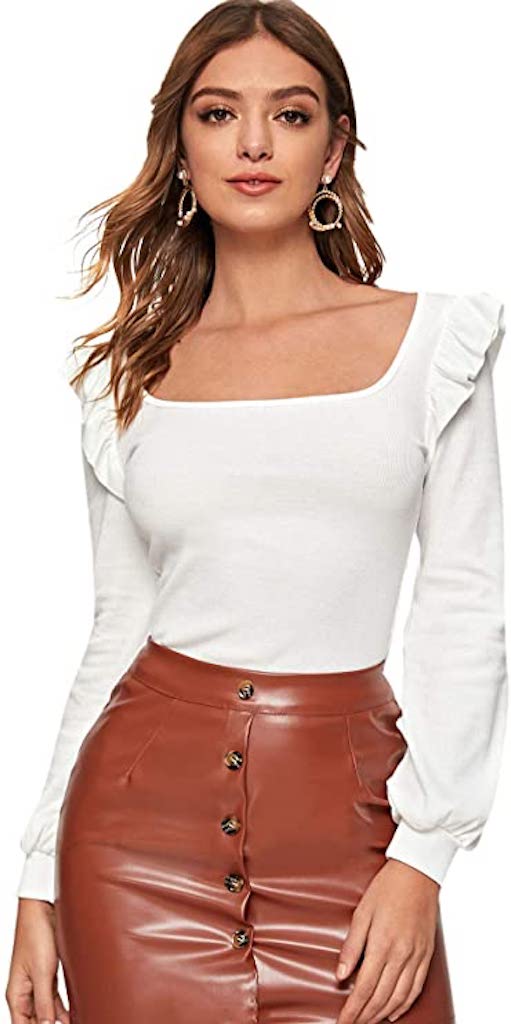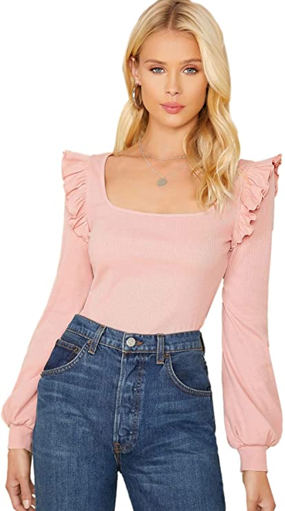 SheIn Women’s Long Sleeve Scoop Neck Ruffle Trim Top Blouse